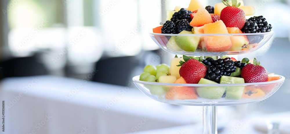 • A two-tiered fruit display featuring a variety of fresh fruits.