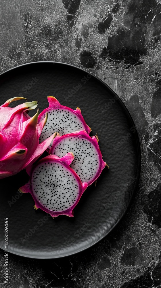 • Freshly sliced dragon fruit on a sleek black plate, minimalist aesthetic.