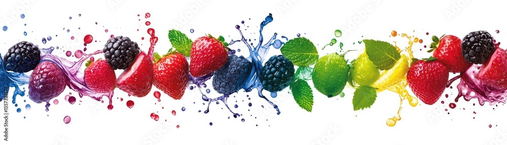 • Rainbow fruit splash; berries, citrus; healthy food; white background; recipe website