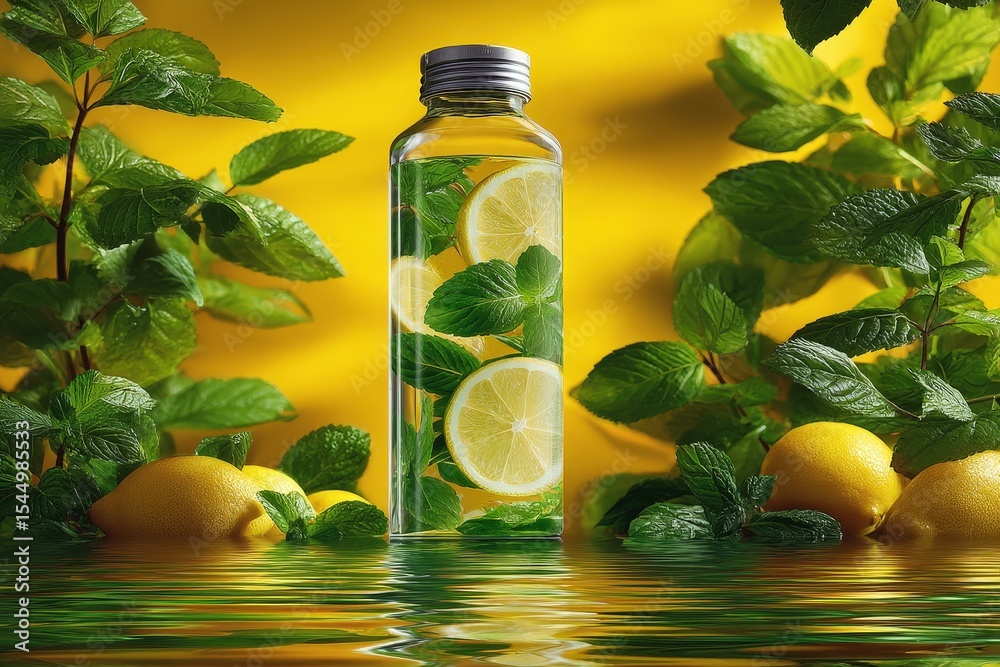 • Refreshing lemon mint infused water in a glass bottle surrounded by citrus fruits and mint leaves