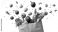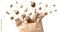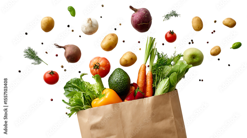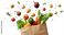 • Grocery bag with fresh fruits and vegetables on a white background, top view. Concept of healthy eating or a food delivery service.