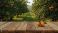 Panel Szklany Owoce - Empty wooden tabletop with decorative space and sunlit orange trees bearing fruit #1712907614