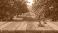 • Empty wooden tabletop with decorative space and sunlit orange trees bearing fruit