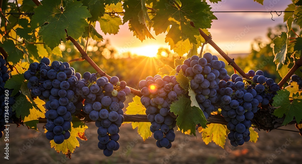 • Grape vines with ripe fruit at sunset in vineyard landscape