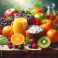 • Colorful fruit and juice on a rustic wooden surface