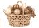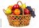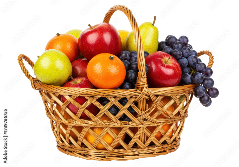 • Isolated arrangement of colorful fruit overflowing from a wicker basket on seamless backdrop