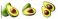 • Fresh ripe green avocados whole and cut in half displaying creamy yellow flesh and large brown pits isolated on white