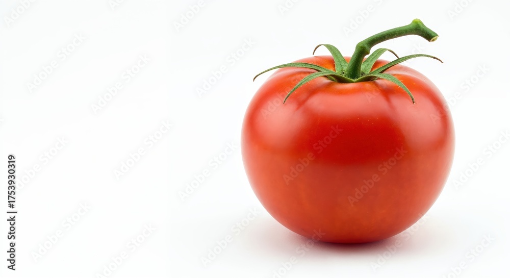 • Tomato's Vibrant Perfection: A close-up shot of a luscious, ripe tomato, showcasing its smooth, bright-red skin and a touch of green stem. Perfect for conveying freshness and natural goodness.