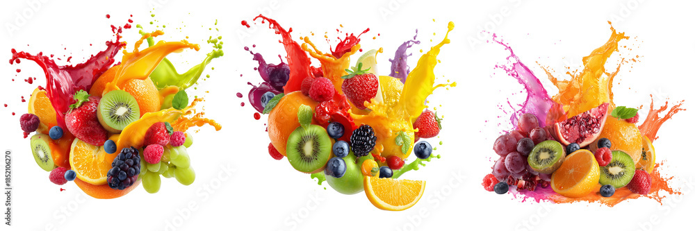 • Set of A refreshing splash of orange juice bursting through mixed fruit pieces natural textures on transparent png background. Ai generated