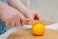 • A woman's hands cut a lemon with a knife on a wooden board