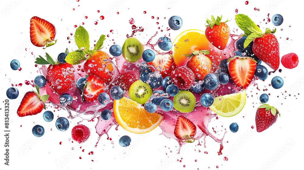 • Fruit and berries burst.Splash of juice.Sweet tropical fruits and mixed berries.