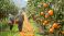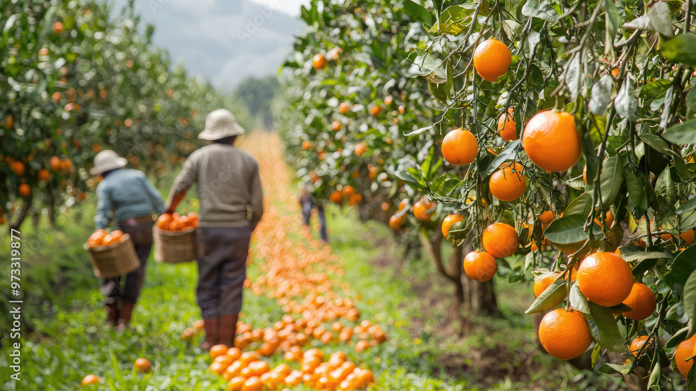 • Harvesting ripe oranges in vibrant orchard, workers gather fruit joyfully