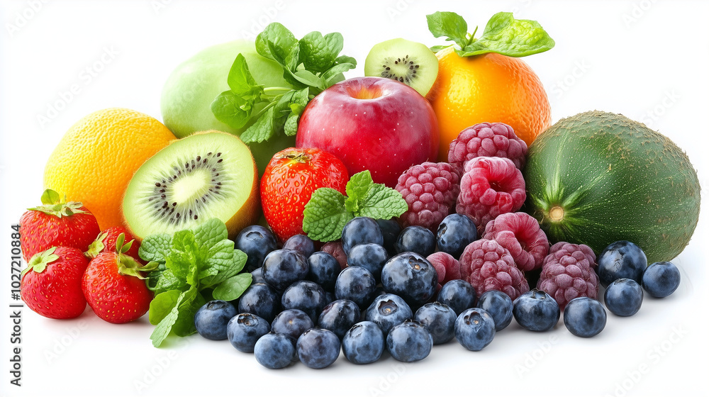 • Na stole znajdują się różnorodne owoce i warzywa w intensywnych kolorach
