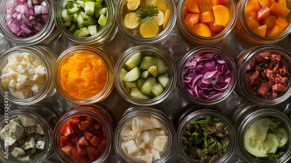 Panel Szklany Jedzenie i Napoje - W przezroczystych słoikach widzimy różnorodne, kolorowe fermentowane jedzenie, pełne zdrowych... #1073244398