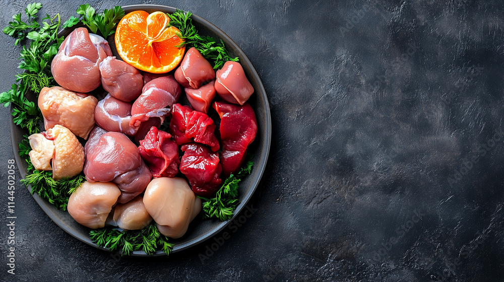 Panel Szklany Jedzenie i Napoje - Widok z góry na surowe podroby drobiowe starannie ułożone. #1144502058