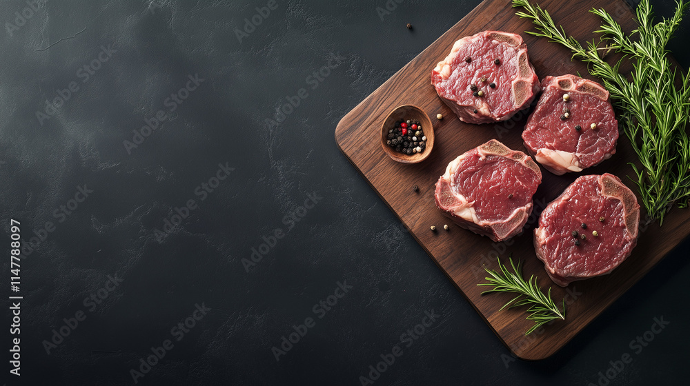 • Apetyczne kotlety z jagnięciny w estetycznym układzie na drewnianej desce, widziane z góry, z miejscem na dodatkowe treści na ciemnym tle.