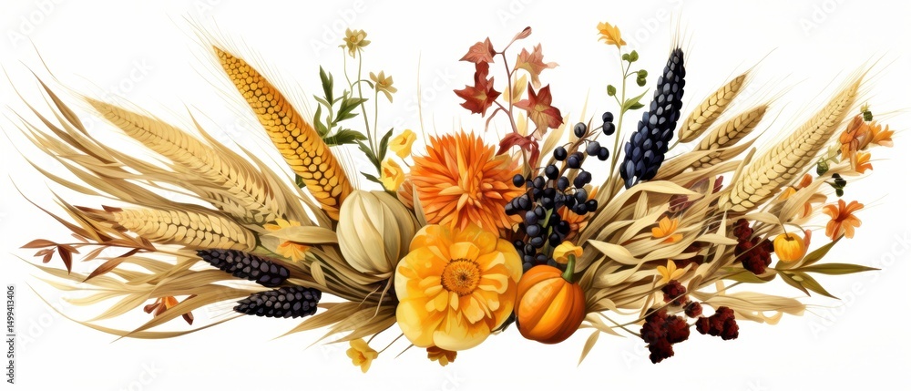 • Jesienna kompozycja roślinna z zbożami i kwiatami