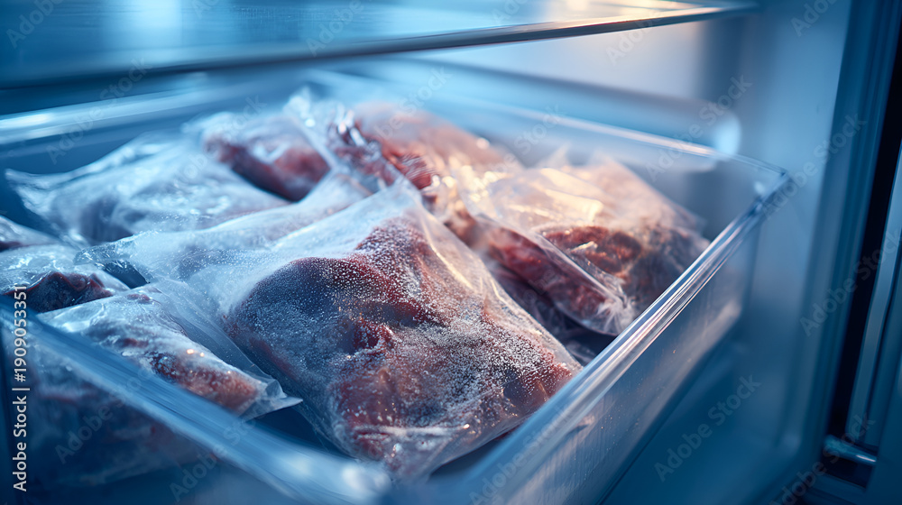 Panel Szklany Jedzenie i Napoje - Zamrożone mięso w szufladzie zamrażarki – przechowywanie żywności, mrożenie, zapasy i... #1909053351