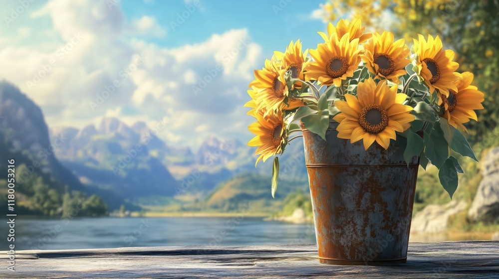 • Jasne słoneczniki w metalowej doniczce, umieszczone na tle malowniczego krajobrazu na świeżym powietrzu.