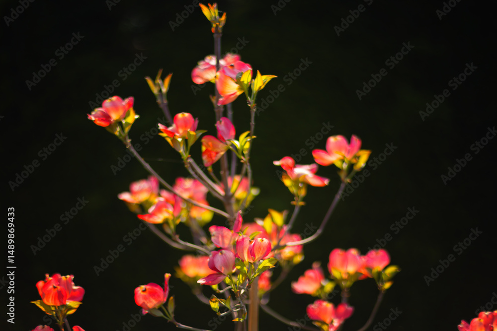 • Różowe kwiaty derenia kwiecistego (dereń kwiecisty Cornus florida Cherokee Chief), tło wiosenne, tapeta kwiatowa