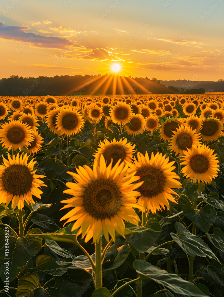 • Pole słoneczników o zachodzie słońca, z promieniami światła oświetlającymi kwiaty