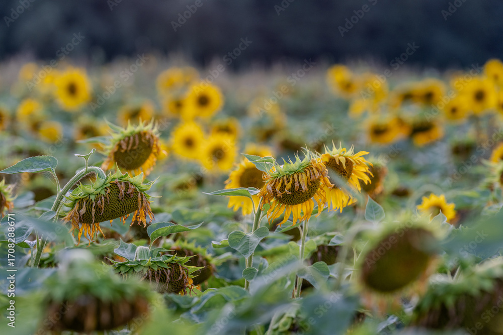 • Słonecznik na polu słoneczników, żólte kwiaty w pełnym rozkwicie zbliżenie