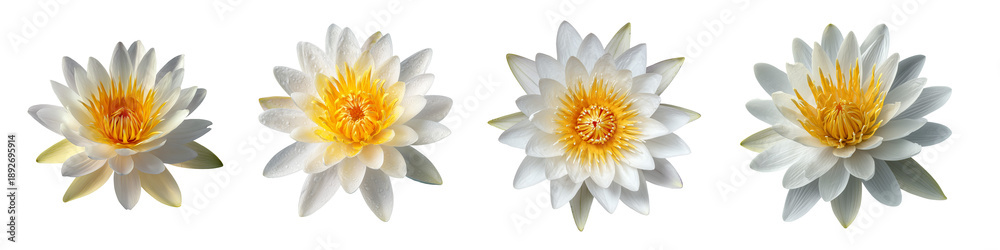 • Białe kwiaty lilii wodnej z żółtym środkiem na przezroczystym tle