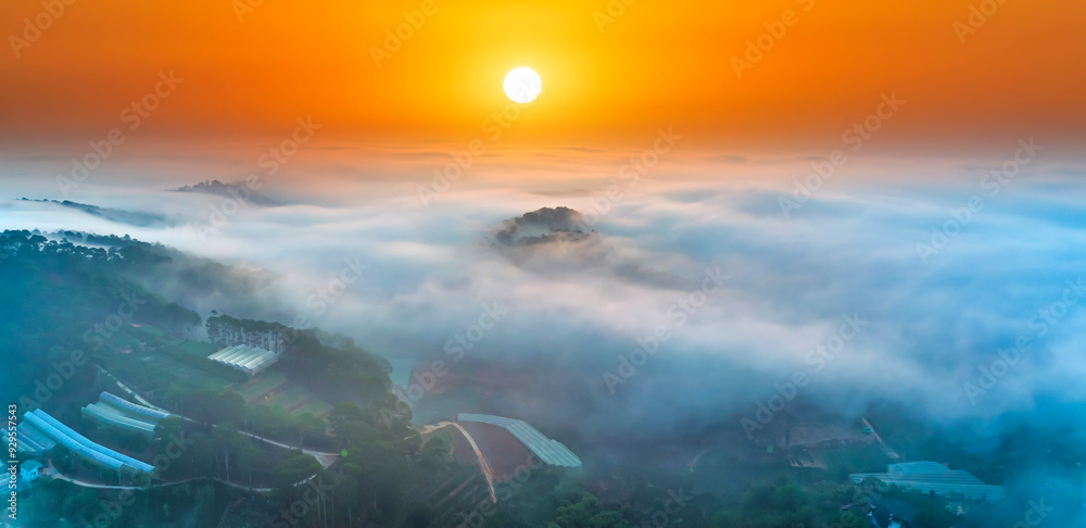 • Aerial view of Xuan Tho suburbs near Da Lat city at morning with misty and sunrise sky. This place is considered most beautiful and peaceful place to watch sunrise in highlands of Vietnam