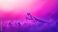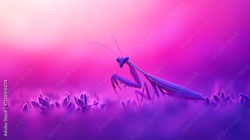• A purple praying mantis rests on a bed of purple flowers with a soft pink and purple background