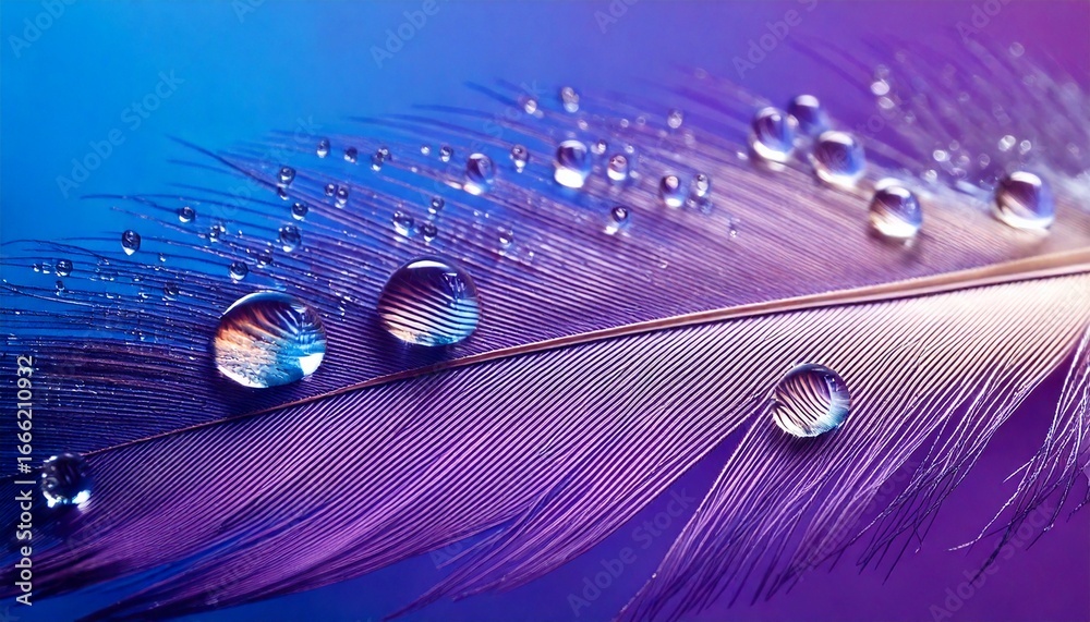 • Beautiful transparent drops of rain water on a feather on a blue and violet background, macr.jpg
