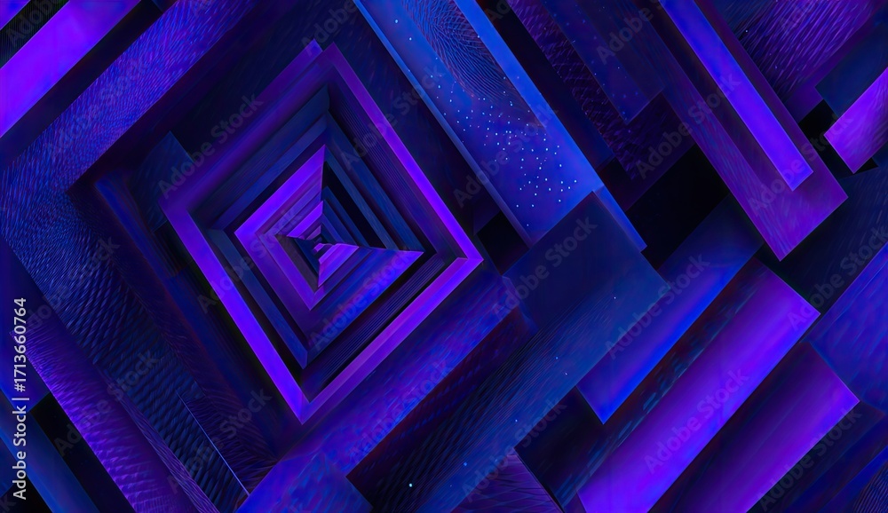 • Abstract geometric pattern of interlocking squares and triangles in deep purple and violet hues, creating a tunnel-like perspective
