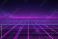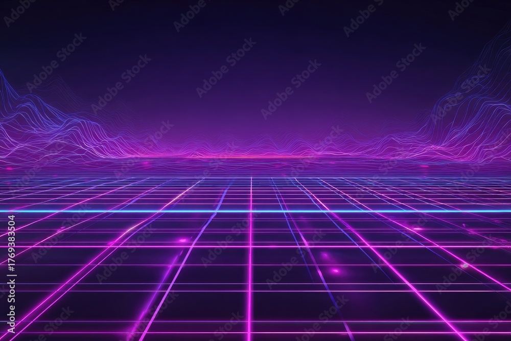 • Retro-styled digital landscape with glowing grid floor and wavy lines