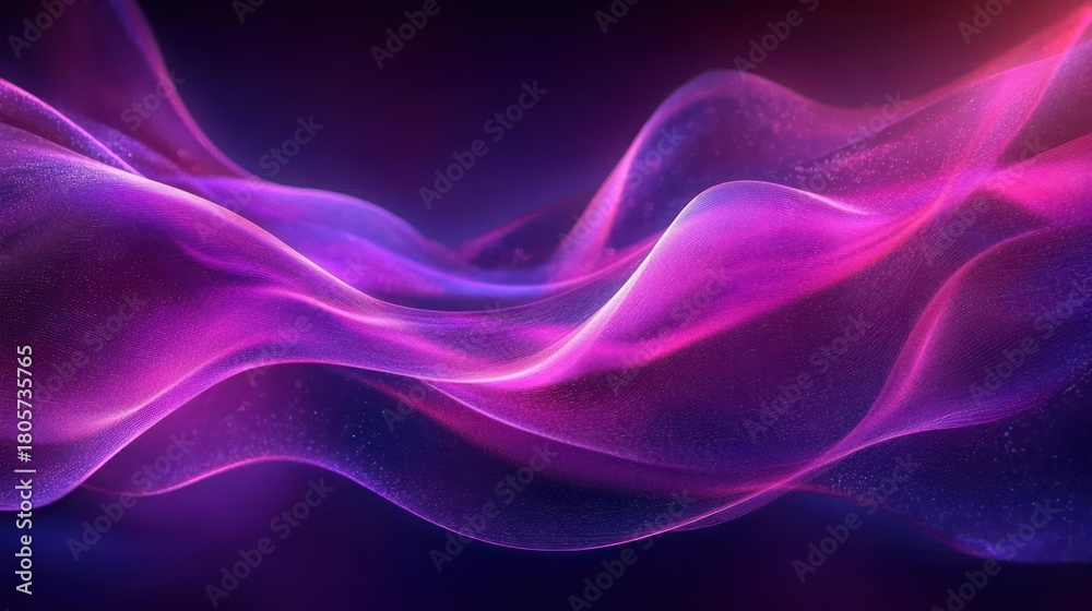 • Glowing translucent purple and pink ribbons flowing like silk with sparkling particles over a dark background, evoking a dreamy, ethereal and calm futuristic mood