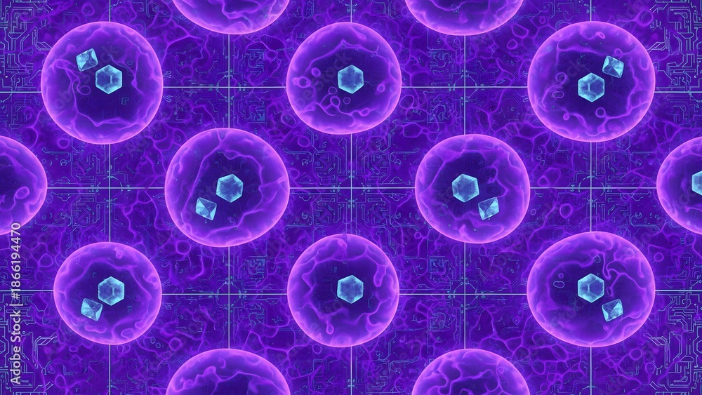 • Seamless pattern of glowing purple microscopic cells containing geometric blue crystals representing quantum data storage