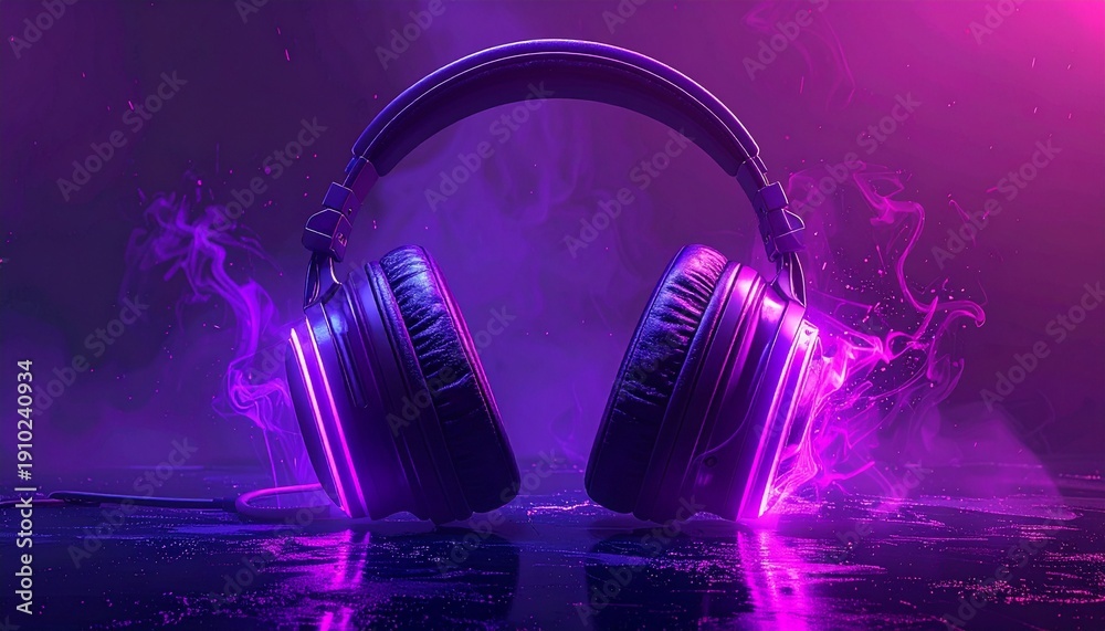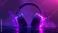 • Purple neon gaming headset glowing in dark studio with smoke effects, symbolizing immersive audio experience and high-tech esports culture