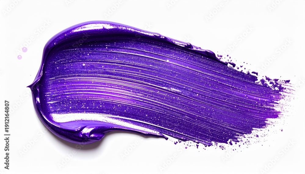 • Vibrant violet purple liquid eyeshadow stroke with metallic glow and fine shimmer on isolated white background. Professional decorative cosmetics and bold evening makeup concept