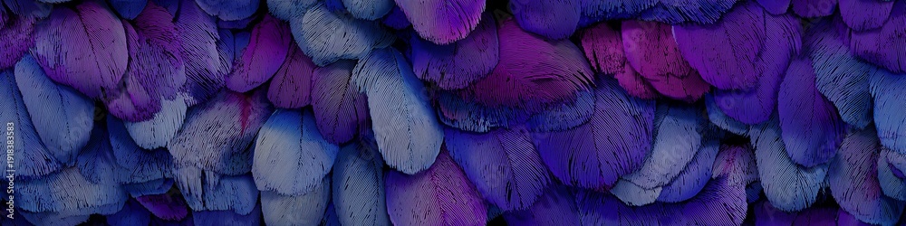 • Purple and blue feathers creating abstract texture background. Overlapping purple and blue feathers creating a soft, natural, and rich textural pattern