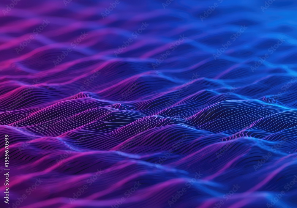 • Abstract blue and purple background showing digital sonic wave forms repeating across the surface creating a modern dynamic visual effect, pulse, cool, acoustic
