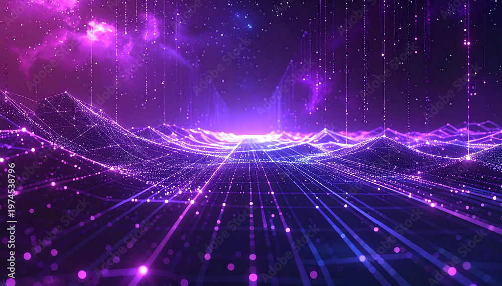 • Global Data Network Landscape with Glowing Plexus Grid and Purple Light Trails
