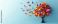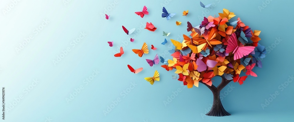 • Colorful paper butterflies form a tree against a light blue backdrop