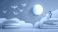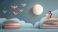 • Woman reading on books with origami cranes and moon in dreamy scene