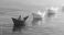 • Close-up of red paper boat leading white boats on calm water, soft focus
