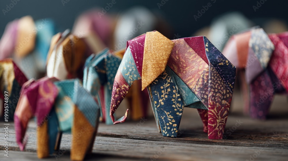 • Colorful origami elephant on rustic wood table. Creative paper craft artwork for decoration and hobby concept. Miniature animal art.