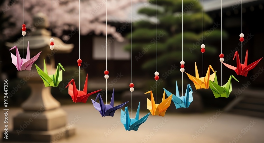 • Colorful origami cranes hang from strings with red beads in a serene outdoor setting with blurred Japanese garden background.