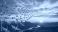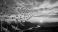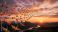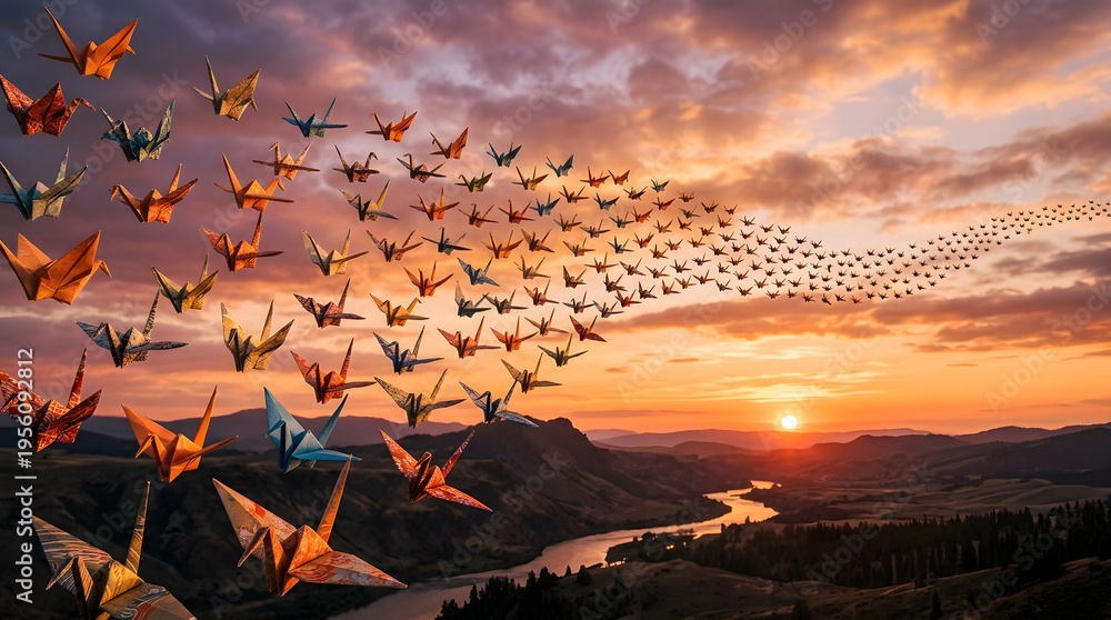 • Swarm of origami cranes flying into distance over a dramatic sunset landscape
