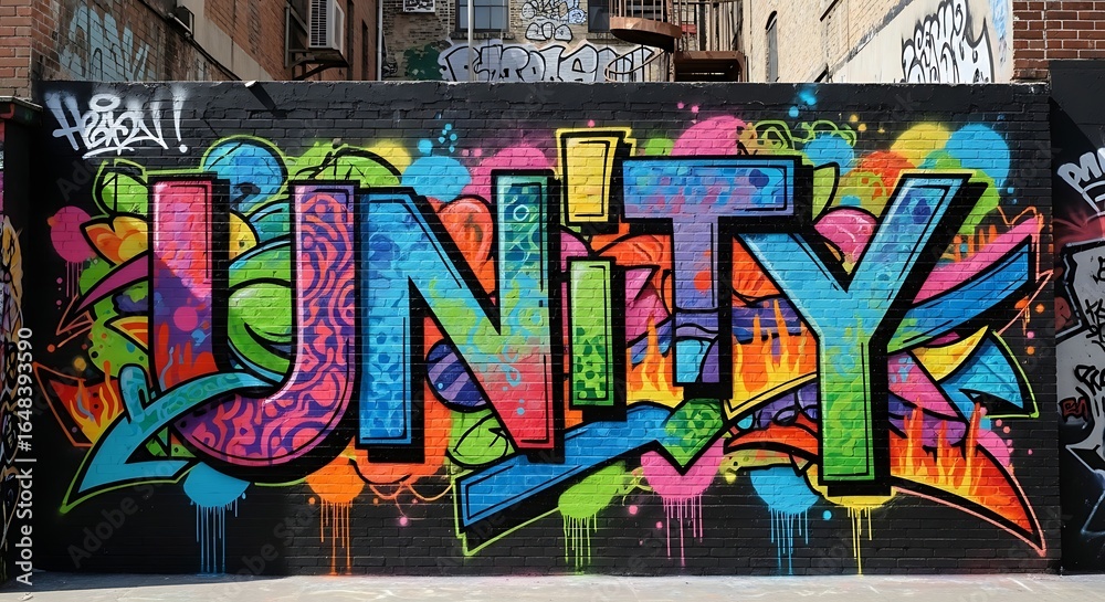 • Vibrant Graffiti Art Depicting the Word 'Unity' in a Colorful Urban Setting