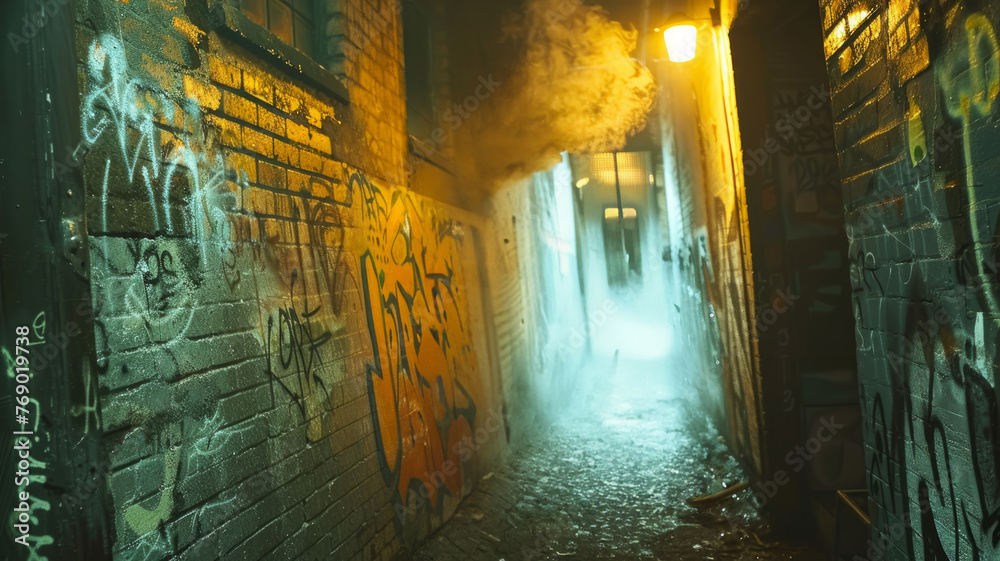 Panel Szklany Street Art - An alley with graffiti at night #769019738