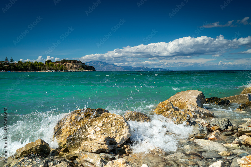 Panel Szklany Kamień - Fale rozbijające się o kamienie na brzegu. #1374615651