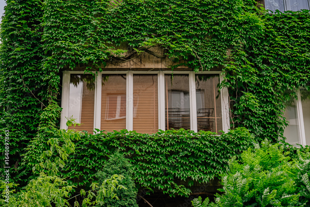 Panel Szklany Kamień - Bluszcz pokrywa ścianę kamienicy #1640897863