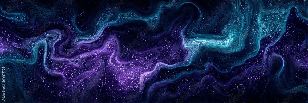 • Abstrakte Nebel und Partikel in Lila und Türkis, die sich in dunklem Raum bewegen, ein kosmischer Hintergrund.